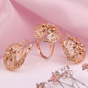 Set din aur roșu 585°. Set filigran din aur rosu 585, format din inel si cercei. Tăierea cu diamant a produsului creează cele mai fine modele pe metal. Jocul de lumină și designul interesant dau impresia că te uiți la un produs cu inserții din diamante reale.