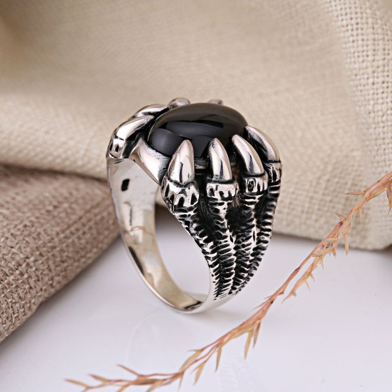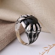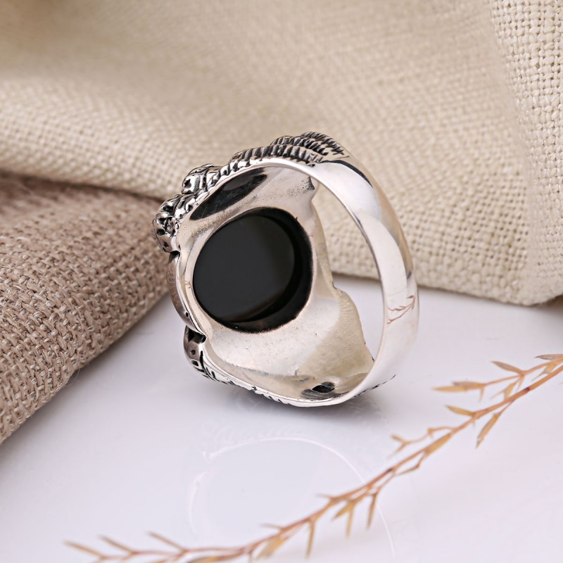 Inelul bărbaților din argint 925 Agate Neagră. Inelul bărbaților din argint 925 înnegrit cu un mare agat negru într -un cadru original. Fiecare bărbat vrea să aibă propriul său accent elegant, un lucru scump care subliniază statutul.
