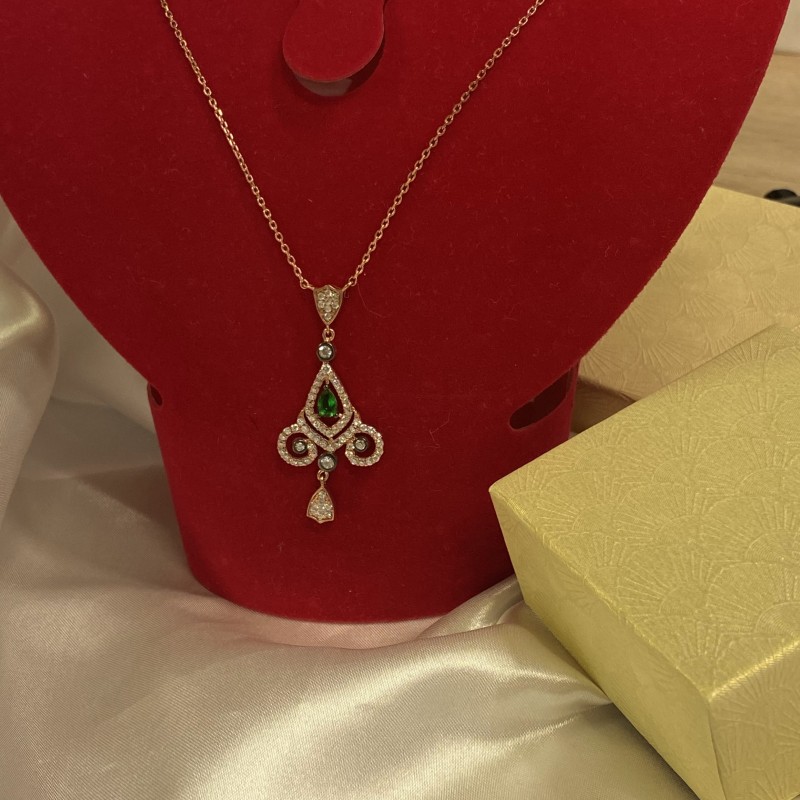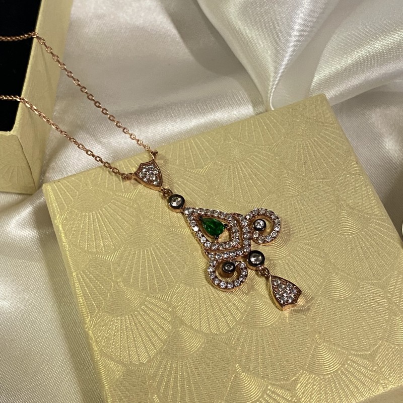 Un colier elegant din argint 925 placat cu aur roșu cu inserție decorativă, decorat cu zirconiu colorat pe fond înnegrit! Plasa de lanț este ancora. Tăiere cu diamant!