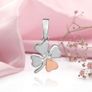Pandantiv din argint în formă de frunză de trifoi cu suprafață în oglindă. argint 925 și aur 375. Argintul cu inserții aurii arată foarte bogat și elegant în comparație cu argintul clasic. Strălucirea și frumusețea sa îți vor îmbogăți minunat imaginea. O doamnă cu astfel de bijuterii va arăta elegantă și sofisticată.