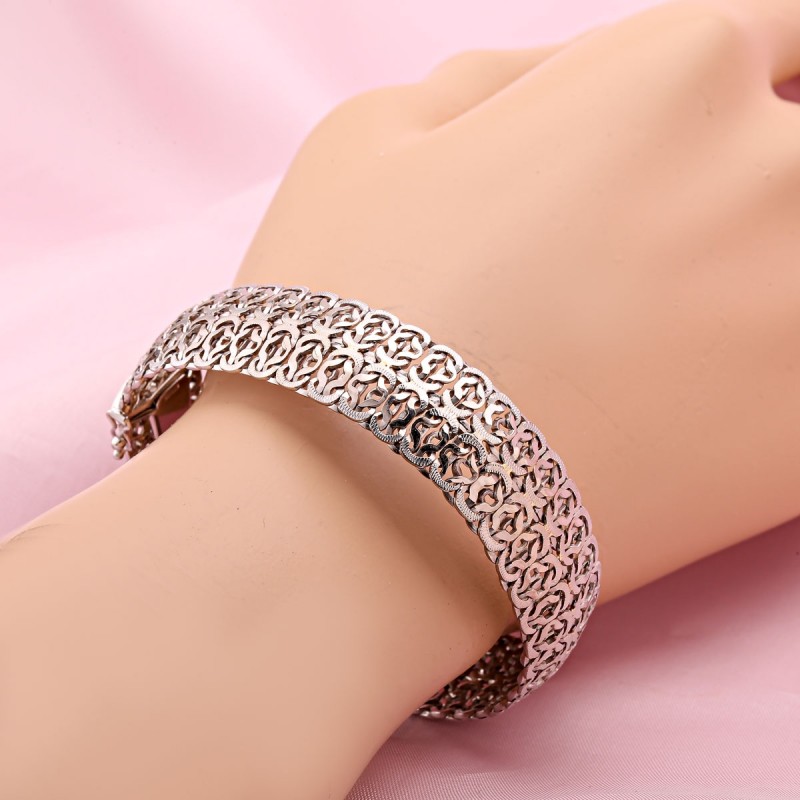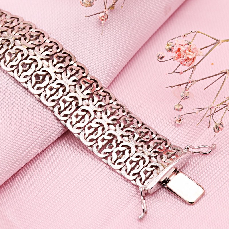 Deși designul pare ajurat, modelul de împletitură compact, bine lucrat, creează impresia unei brățări solide și închise. Acest efect face ca bijuteria să pară deosebit de nobilă și valoroasă - ca un brăț elegant dintr-o singură bucată de metal. Se înfășoară moale și uniform în jurul încheieturii și îi subliniază forma într-un mod feminin și în același timp expresiv.