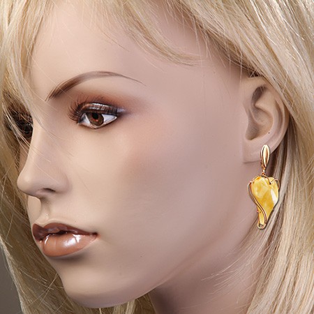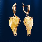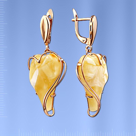 Cercei frumoși din rusă solidă 585 (14kt) Aur roșu proiectat cu un chihlimbar mare, întărit delicat (aproximativ 25 x 16 x 5 mm). Chihlimbarul dreptunghiular creează o atracție armonioasă a ochilor în tonuri calde. Cerceii întregi măsoară aproximativ 45 x 18 mm, sunt echipați cu un știft și cu spate pliabil și pot fi purtați numai cu perforați. lobii urechilor.