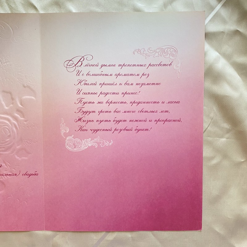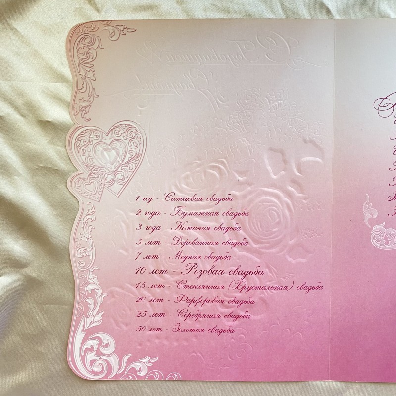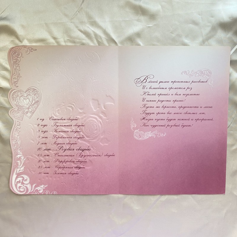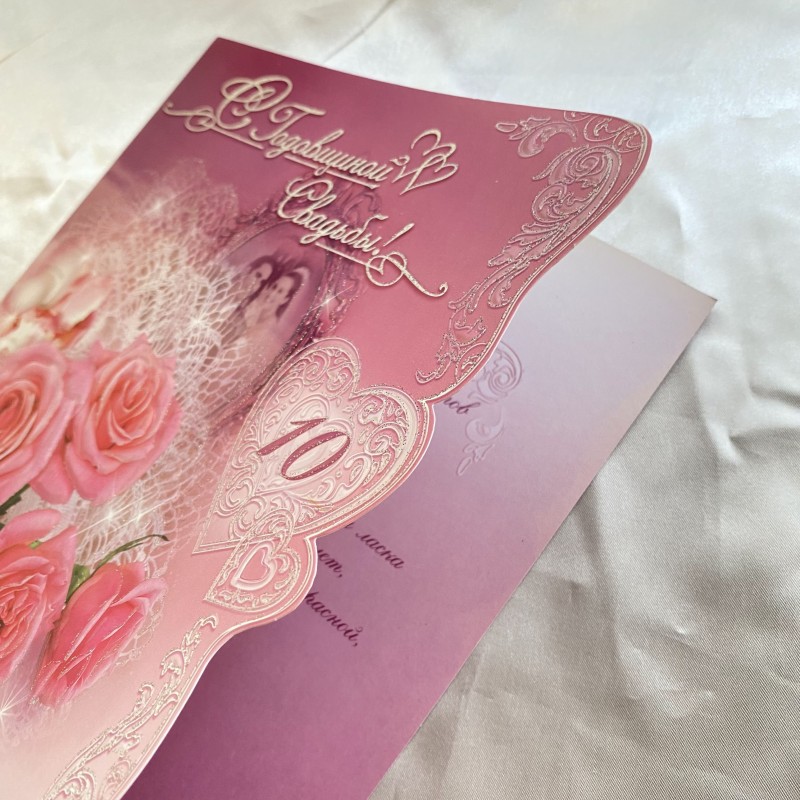 Felicitare delicată de felicitare pentru nuntă (10 ani) - un plus grozav pentru un cadou! Hârtie texturată, margine ondulată. Cardul este presărat cu sclipici mici, florile, inima și inscripția reprezentate sunt subliniate prin tehnica de relief, creând un efect 3D. Pe interiorul felicitării este imprimată o poezie frumoasă și o listă de aniversări de nuntă.