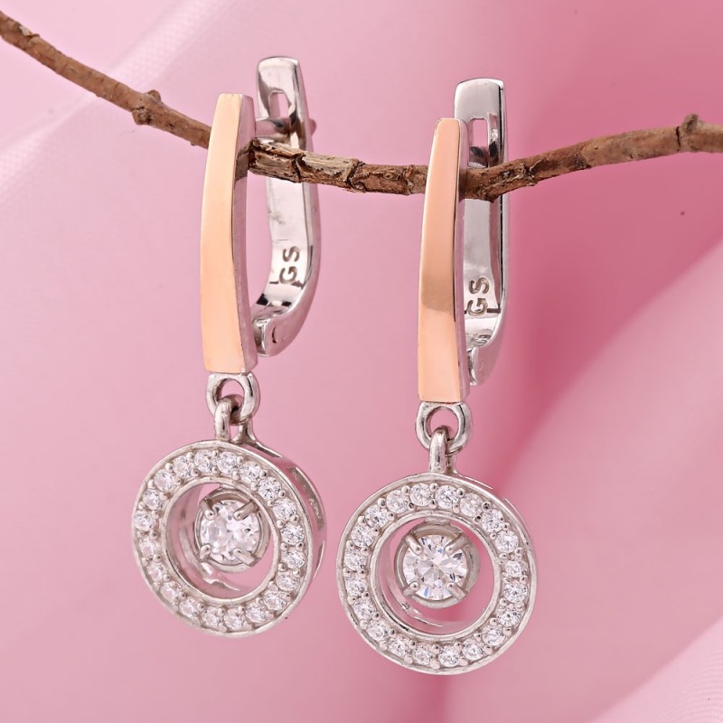 Cercei din argint cu zirconiu dansant din aur. Cerceii frumoși sunt din argint 925 cu aur 375 și au zirconii strălucitoare și dansatoare! Astfel de cercei emană șic și irezistibilitate. Cu ele vei fi atrăgătoare în orice ținută! Placat cu rodiu!