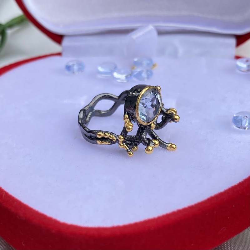 Un inel fermecător din argint 925 înnegrit cu placare cu aur galben solid, decorat cu topaz mare frumos. Datorită accentelor plasate cu pricepere folosind placarea cu aur, inelul arată unic de frumos. O completare excelentă pentru imaginea ta de feminitate și romantism.
