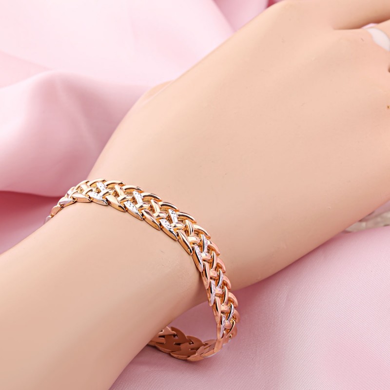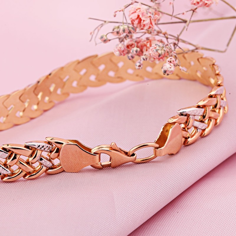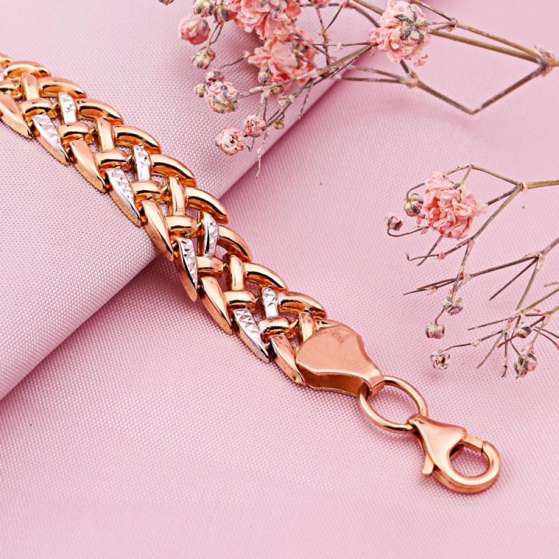 Brățară din aur roșu/aur alb 585 °. Brățara grațioasă și voluminoasă din 585 de aur alb și aur roșu cu tăietură de diamant spumant. Interiorul brățării este neted cu o suprafață oglindă. Parantezele din aur au stabilit accentul necesar în imagine și atrag atenția asupra bogăției și luxului accesoriilor, deoarece aurul este frumos, elegant, elegant și scump. Se potrivește atât cu o doamnă solidă, cât și la o tânără