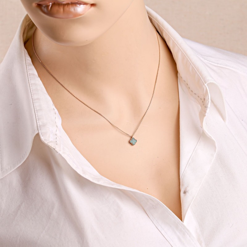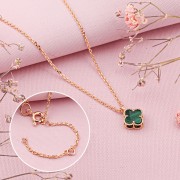 Elementul cu patru foi apare limpede și armonios, în timp ce malachitul dă caracter bijuteriei. Structurile sale fine și gradienții de culoare fac ca fiecare piesă să fie unică vizual. În combinație cu aurul roșu cald, se creează un aspect deosebit de elegant și expresiv.