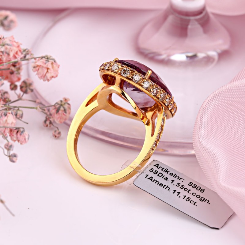 Красное золото 750 пробы, бриллианты и аметисты. Умелое использование бриллиантов создает уникальный узор, привлекающий внимание. Красивый подарок любимому человеку!