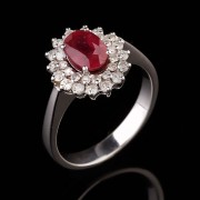 Кольцо из желтого/белого золота 585°, украшенное бриллиантами классической огранки 0,14 H S1; 1 рубин 6,0 х 4,0 мм 0,50
