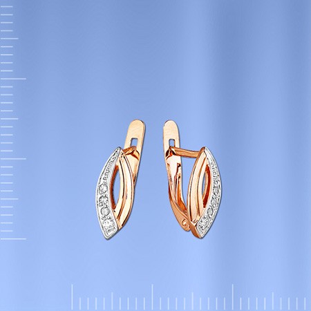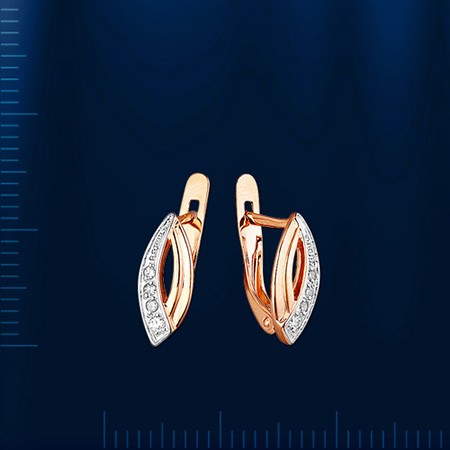 Серьги из российского красного/белого золота 585° с 6 бриллиантами классической огранки 0,039 карата, 2 бриллиантами классической огранки 0,031 карата. Высота ок. 14 мм