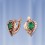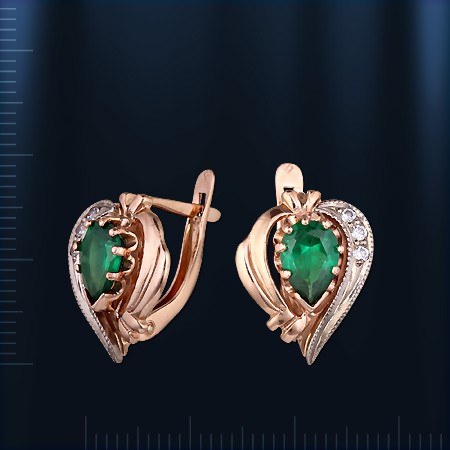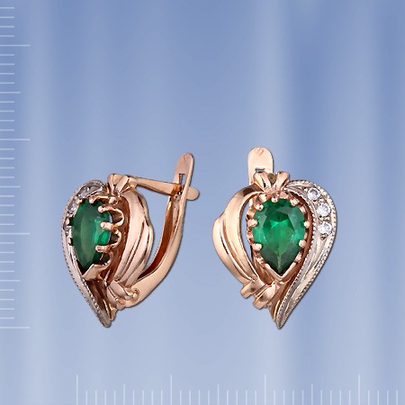 Золотая серьга из красно-белого золота 585°, украшенная 2 изумрудами (8 х 5 мм) и цирконием ¢ 2 мм. Высота ок. 15 мм., ширина ок. 12 мм.