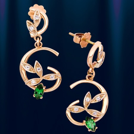 Красивые серьги-пусеты из красного золота 585° ="hps" title="Нажмите, чтобы просмотреть оригинальные переводы">с synthetic Emerald и бесцветный Циркон. Длина 33 мм, вес 6,4 гр.