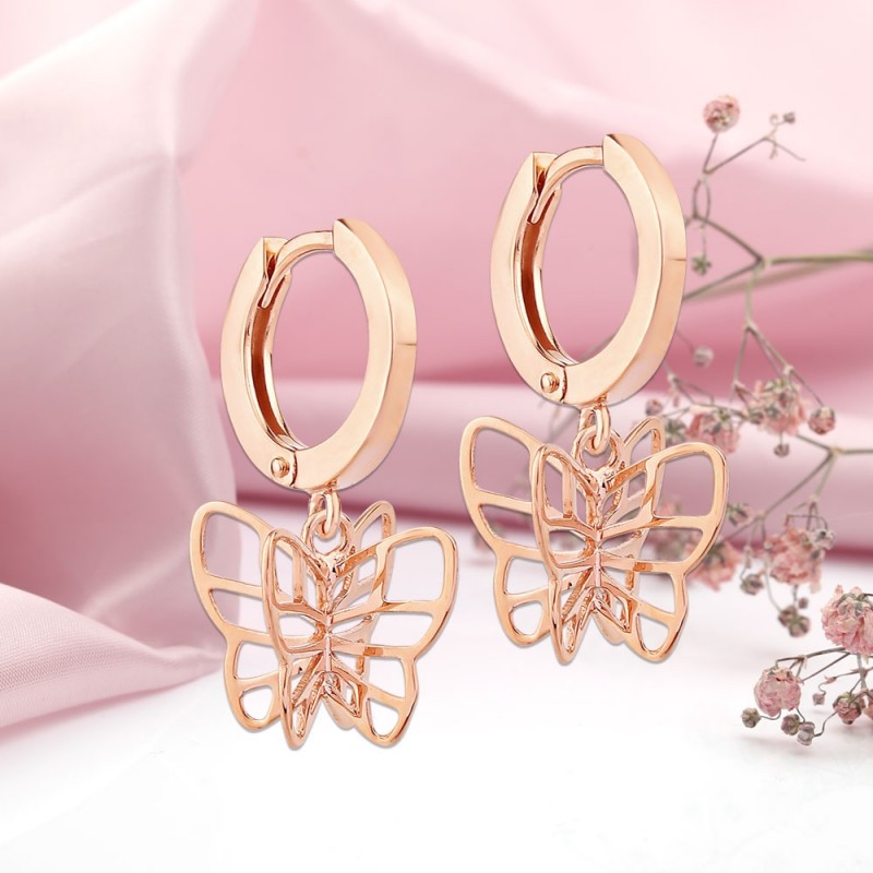 Серьги розовое золото Российское золото 585 пробы. Женственные серьги из красного золота 14 карат с подвесками в виде объемных бабочек. Серьги игриво качаются и блестят, подчеркивая нежность и очарование вашей красоты! Прекрасный подарок близкому человеку!