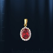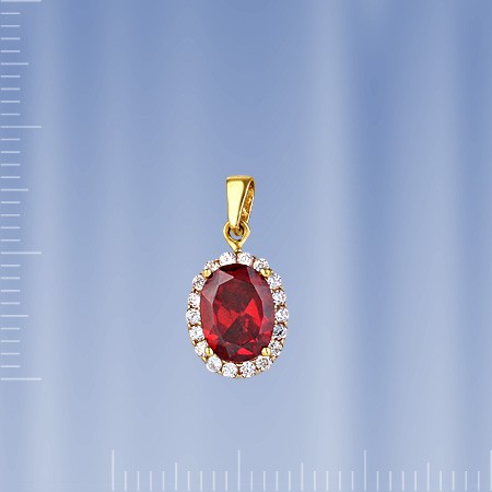 Кулон из российского желтого золота 585°. Кулон украшен гранатом (8 х 6 мм), 18 фианитами Ø 1 мм. Высота с ушком ок. 18 мм, ширина ок. 8 мм.