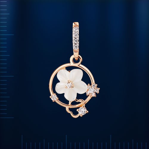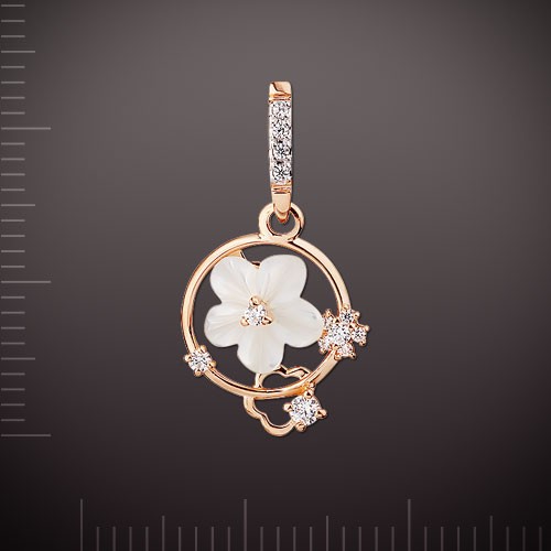 Кулон из русского красного золота 585°. Кулон декорирован перламутром ¢ 8,0 мм, 9 фианитами ¢ 1,0 мм, 3 фианитами ¢ 1,5 мм и фианитами ¢ 2,0 мм