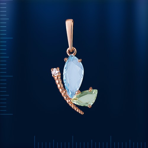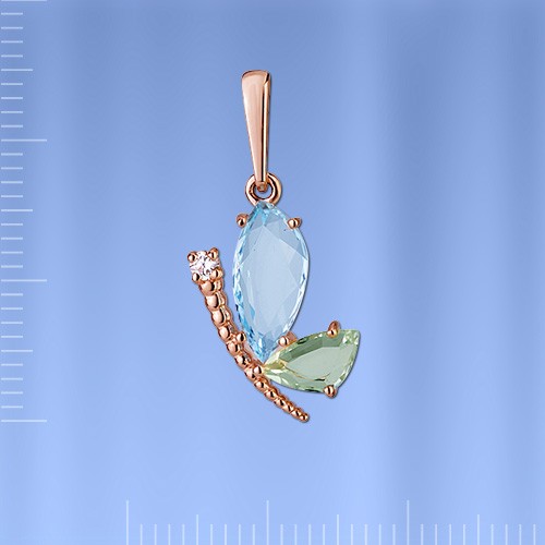 Кулон из русского красного золота 585°. Кулон выполнен из топаза (11,0 х 5,0 мм 0,28), зеленого аметиста (7,0 х 4,0 мм 0,096), 1 фианита ¢ 2,0 мм 0,012