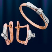 Комплект из русского красного/белого золота 585°. Состоит из кольца FYZ0006 с бриллиантом 0,04 карата и серег GFK0011 с 2 бриллиантами 0,08 карата. Серьги с английским замком, простые, надежные и долговечные. Купите эти товары в наборе и сэкономьте 15?