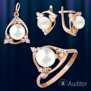 Комплект из русского красного золота 585° с жемчугом и цирконием. Комплект состоит из кольца R79932, кулона A86823 и сережек OR91657.