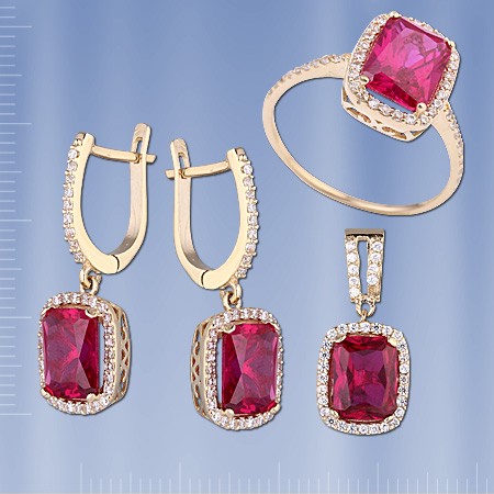 Комплект из российского желтого золота 585° с синтетическим рубинами состоит из: