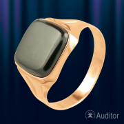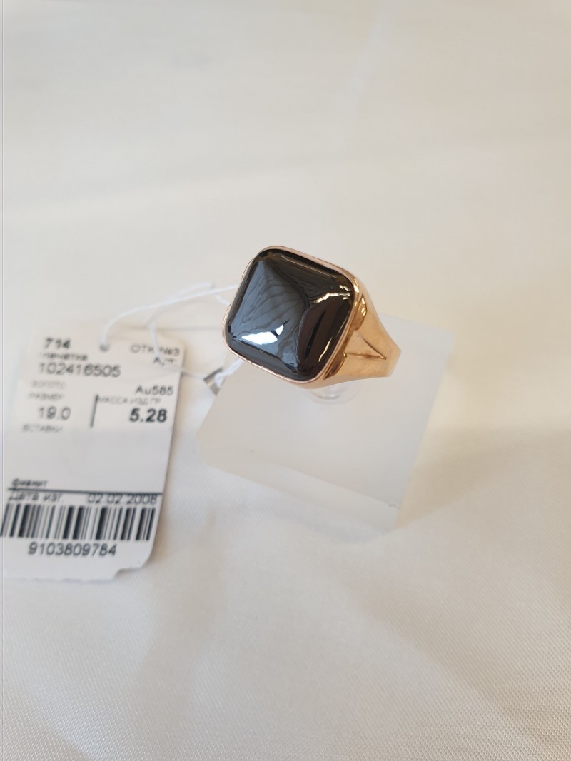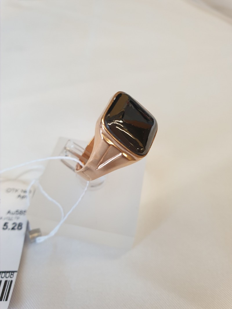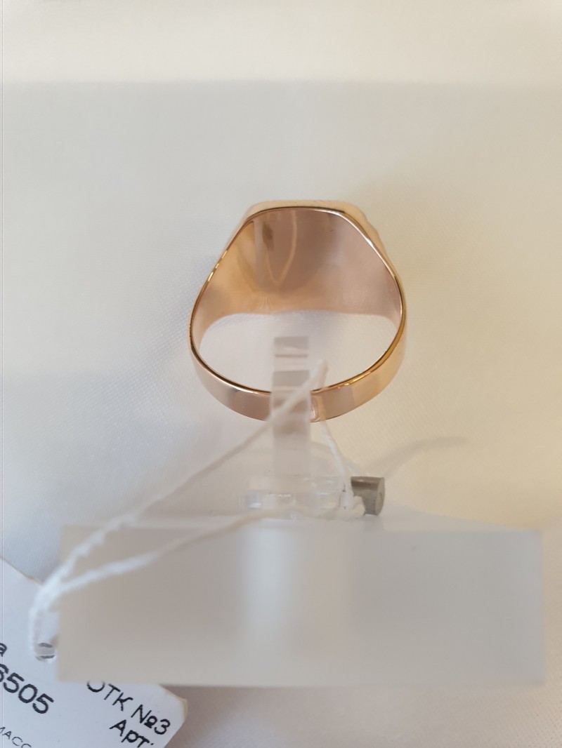 красного золота 585°, украшено черным фианитом. На внутренней закрытой поверхности кольца имеется клеймо пробы золота.