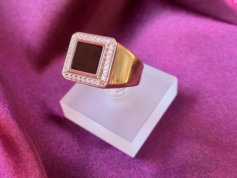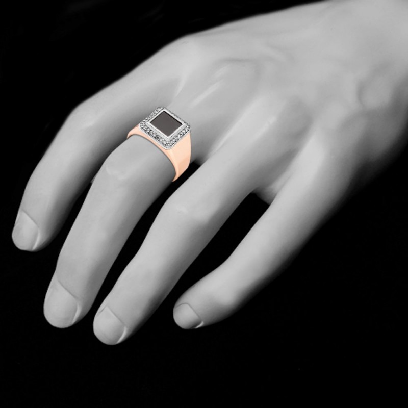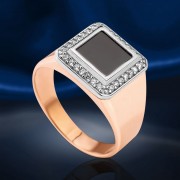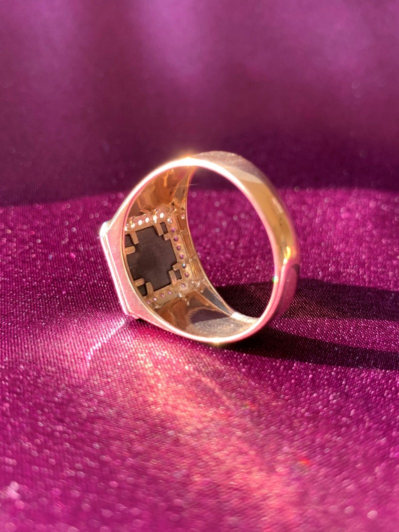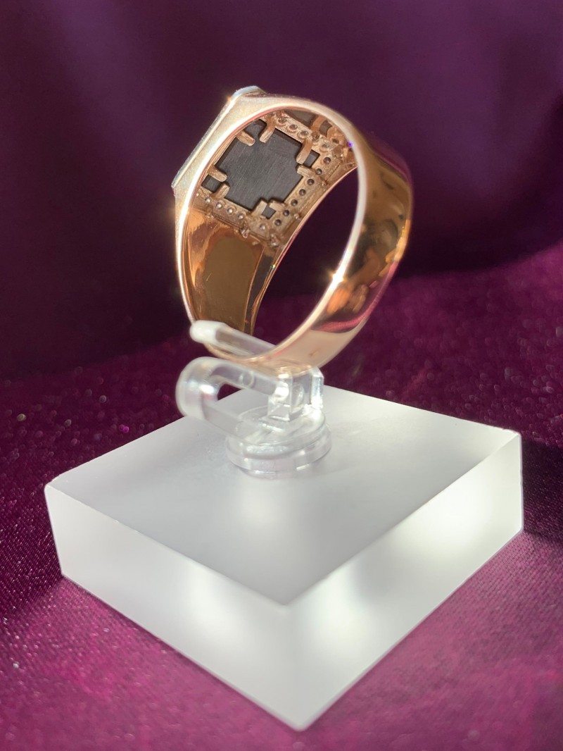 Мужское кольцо - перстень-печатка, выполнено из русского красного золота 585°, украшено черным фианитом. На внутренней закрытой поверхности кольца имеется клеймо пробы золота.