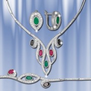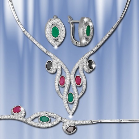 Серебряный комплект 925 пробы с рубином, изумрудом, черным опалом и бесцветным цирконом. Комплект состоит из колье 45 см, браслета 19 см и сережек. Есть серьги с изумрудами, рубинами, а также черным опалом. Высота сережек 15 мм., ширина 10 мм. Серьги с английским замком – просто, надежно и долговечно. Набор продается в подарочной упаковке.