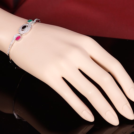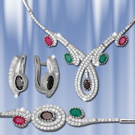 Серебряный комплект 925 пробы с рубином, изумрудом, черным опалом и бесцветным цирконом. Комплект состоит из колье 45 см, браслета 18,5 см и сережек. Есть серьги с изумрудами, рубинами, а также черным опалом. Высота сережек 18 мм., ширина 10 мм. Серьги с английским замком – просто, надежно и долговечно.