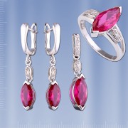 Комплект из серебра 925° состоит из кулона с синтетическим рубином (14 х 7 мм) и цирконием ¢ 1 мм, сережек с синтетическим рубином (12 х 6 мм), циркония ¢ 1 мм и кольца с синтетическим рубином. (15 х 7 мм), цирконий ¢ 1 мм.
