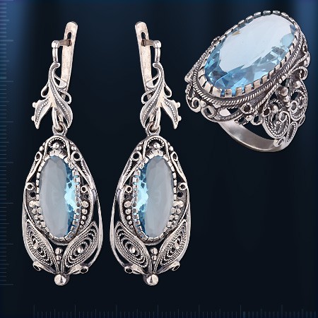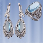 Комплект из серебра 925° состоит из серег с синтетическим топазом (10 х 20 мм) и кольца с синтетическим топазом (11 х 21 мм). Высота сережек ок. 60 мм., ширина ок. 22 мм., высота кольца ок. 27 мм.