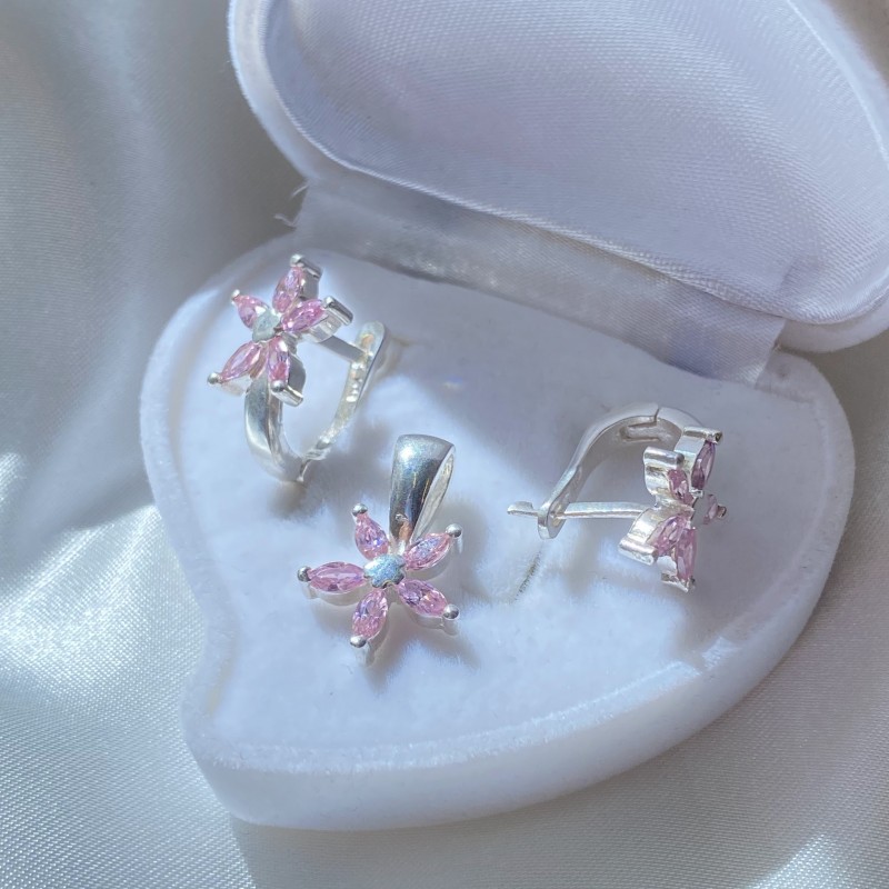 Комплект из серебра 925 пробы со сверкающими розовыми циркониями! Женщины издавна пытались подчеркнуть свою красоту, хрупкость и очарование с помощью украшений. Женские украшения многолики. Они могут отражать как изящество и скромность, так и экстравагантность образа.