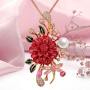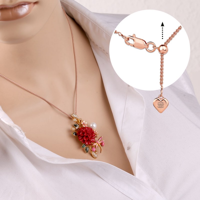 Очаровательное колье из позолоченного серебра 925 пробы с объемным, красочным кулоном, украшенным кораллами, жемчугом, цирконием и эмалью. Основоплетение – «Колос». Благодаря специальному устройству - стопорному шарику - длина цепи регулируется на любой размер в пределах длины цепи! Нежное колье дополнит ваш романтический образ.