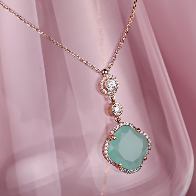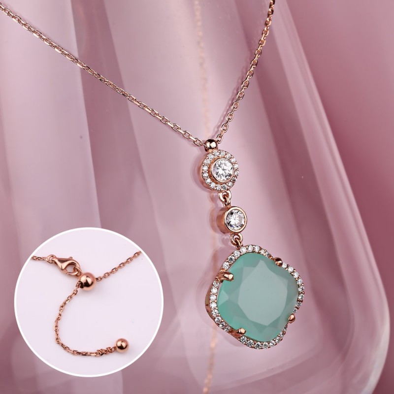 фианитами и красивым хризопразом в красивой позолоченной оправе из серебра 925 пробы с оригинальным, модным дизайном подвески с вытяжным механизмом. Прекрасная возможность побаловать себя или подарить близкому человеку подарок, который подчеркнет нежность, очарование и естественную красоту! Якорная цепочка-плетка с ромбовидной огранкой.