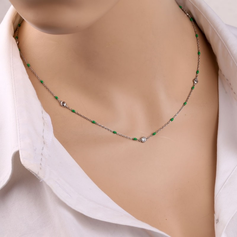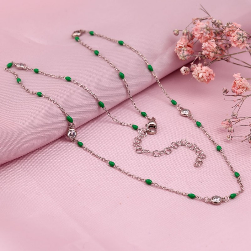 Колье из серебра 925 пробы украшено декоративной вставкой из сверкающих цирконий и зеленой эмали! Основоплетение - якоря, алмазная обработка. Чудесный акцент на вашей нежности и неотразимости.