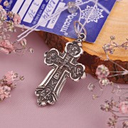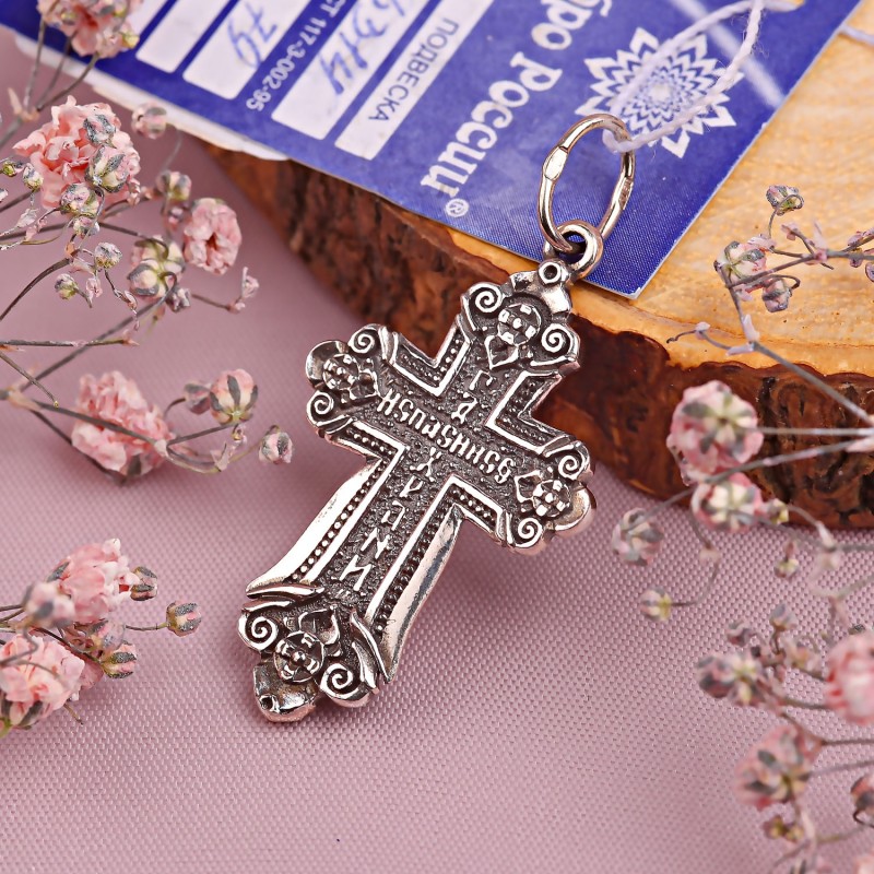 Серебряный нательный крест с распятием из черненого серебра 925 пробы! На оборотной стороне выгравирована надпись: «Спаси и сохрани». Не царапается при ношении.