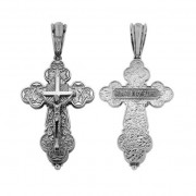 Цельносеребряный нательный крест православный с распятием из черненого серебра 925 пробы! На оборотной стороне выгравирована надпись: «Спаси и сохрани». Не царапается при ношении.