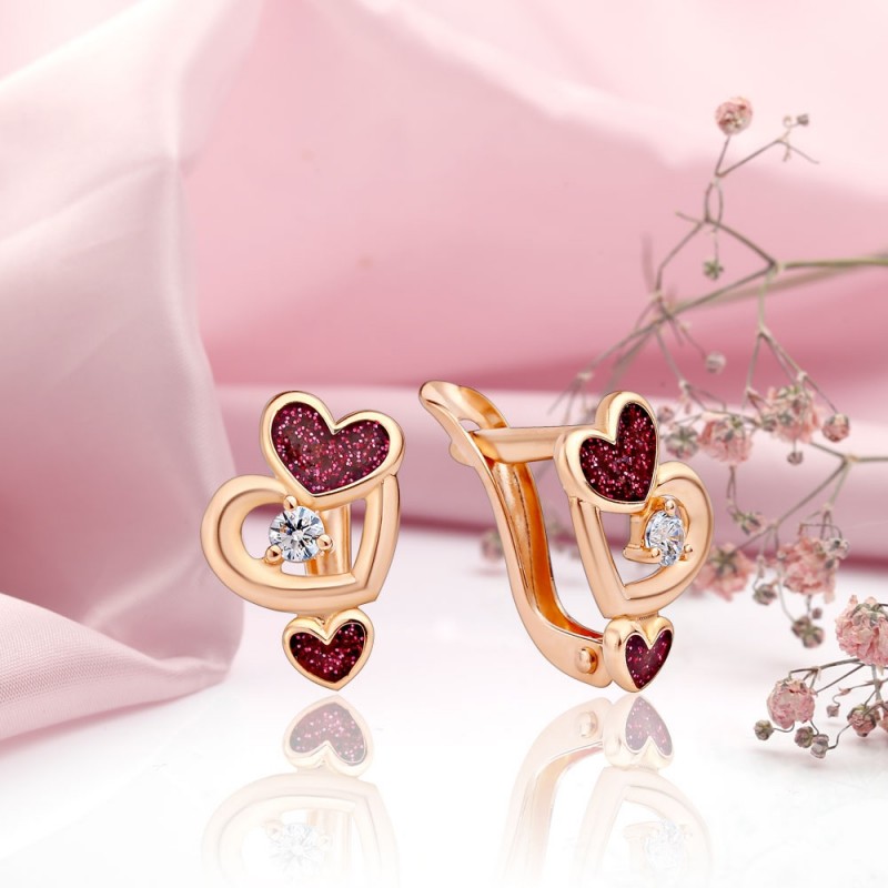 Детские серьги из красного золота "сердечки". Кубический цирконий и эмаль