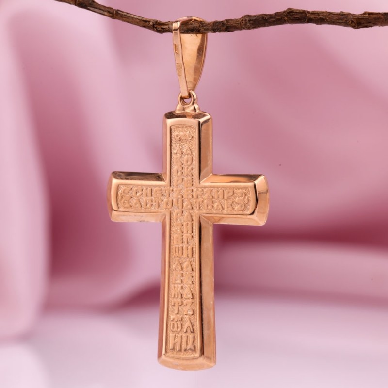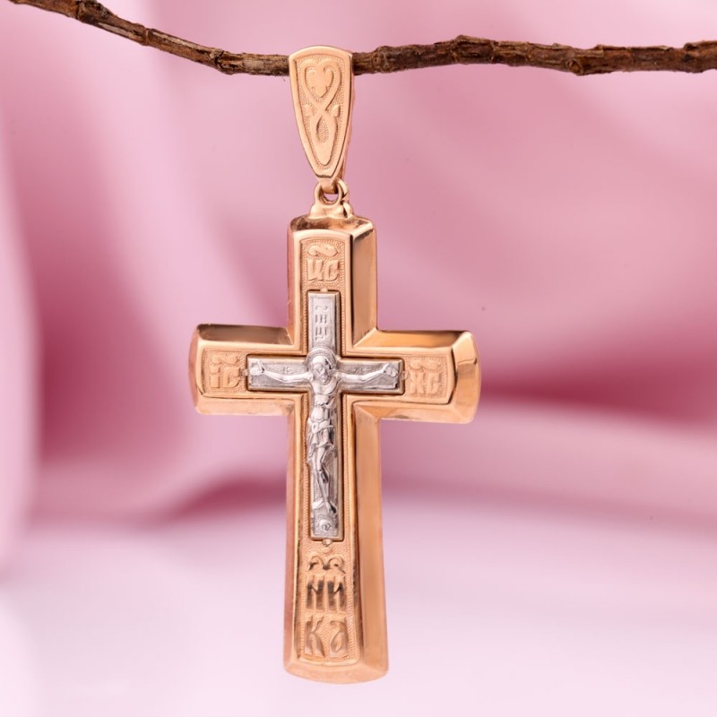 Золотой крестик с распятием из белого/красного золота 585 пробы. На обратной стороне креста имеется надпись. Вверху креста имеется кольцо для шнура или цепочки. Не царапается при ношении.