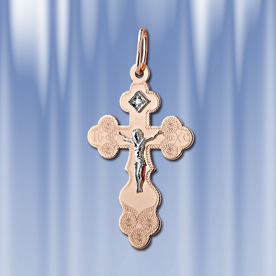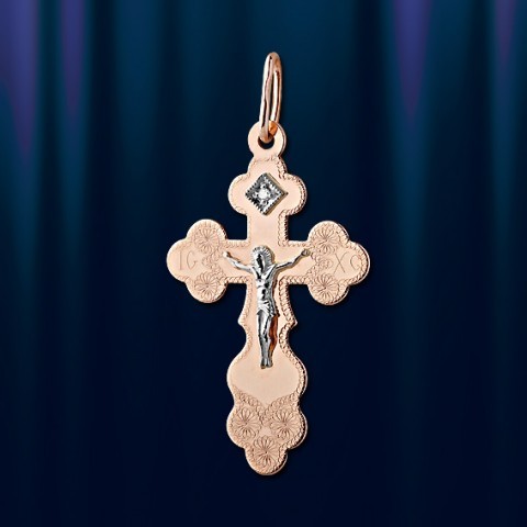 Крестик-кулон из русского золота 585° с бриллиантом 0,01 карат, двухцветный. Длина с ушком ок. 33 мм., ширина ок. 16 мм.