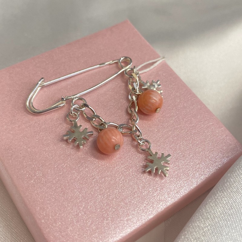 Оригинальная брошь из серебра 925 пробы с подвеской-цепочкой-панцирем, украшенной серебряными снежинками и коралловыми шариками.