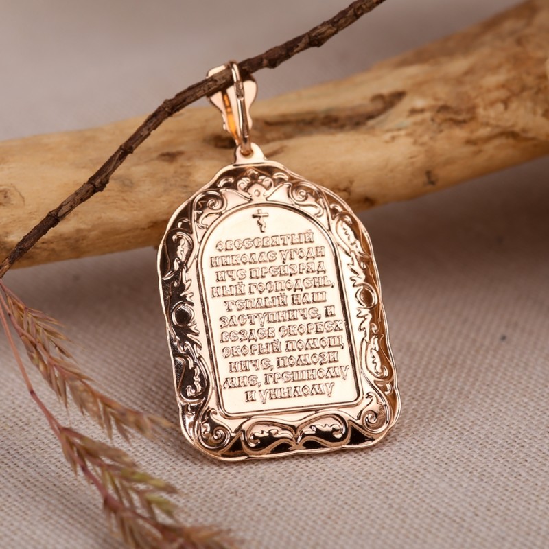 На лицевой стороне гравюра с изображением Николая Чудотворца. На оборотной стороне подвески надпись: «О всесвятый Николае, Господень угодник, наш теплый заступник и скорый помощник везде в беде, помоги мне, грешному и тупому».