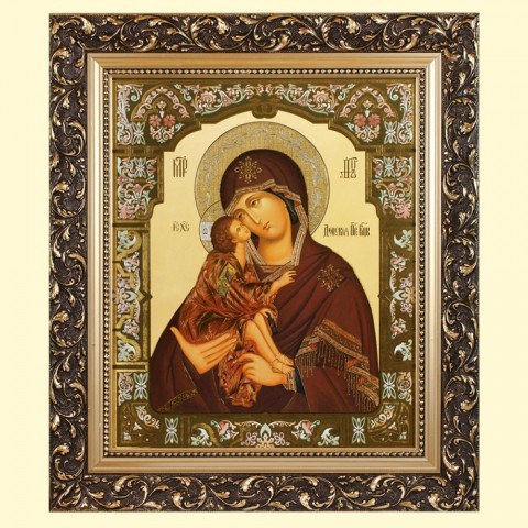 Пресвятая икона Божией Матери Донской 33х40 см, деревянная, двойная печать Достойная. Икона помещена в искусственную гипсовую раму, имитирующую резное дерево, с позолотой. Икону открывает священник храма преподобный Серафима Саровский в Пойнте Софрино.