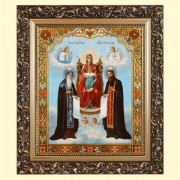 Икона Пресвятой Божией Матери Печерская 33х40 см, деревянная, двойная печать Достойная. Икона помещена в искусственную гипсовую раму, имитирующую резное дерево, с позолотой. Икону открывает священник храма преподобный Серафима Саровский в Пойнте Софрино.