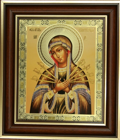 На иконе Божией Матери Семистрельной, Пресвятой изображена Богородица, пронзенная семью стрелами: четырьмя с левой стороны и тремя с правой. Оно написано на слова пророчества святого праведного Симеона, сказанного в Иерусалимском храме на сороковой день по Рождестве Христовом: «Се, это лежит на падении и на восстании многих в Израиле и на предмете обмена, и вам Оружие пойдет в душу.