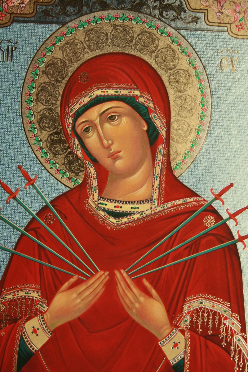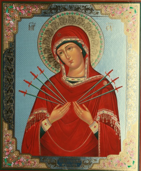 На иконе Божией Матери Семистрельной, Пресвятой изображена Богородица, пронзенная семью стрелами: четырьмя с левой стороны и тремя с правой. Оно написано на слова пророчества святого праведного Симеона, сказанного в Иерусалимском храме на сороковой день по Рождестве Христовом: «Се, это лежит на падении и на восстании многих в Израиле и на предмете обмена, и вам Оружие пойдет в душу.