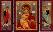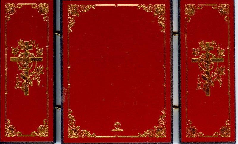 Очень красивая и крепкая икона - складень из дерева, двойное тиснение золотом и серебром.