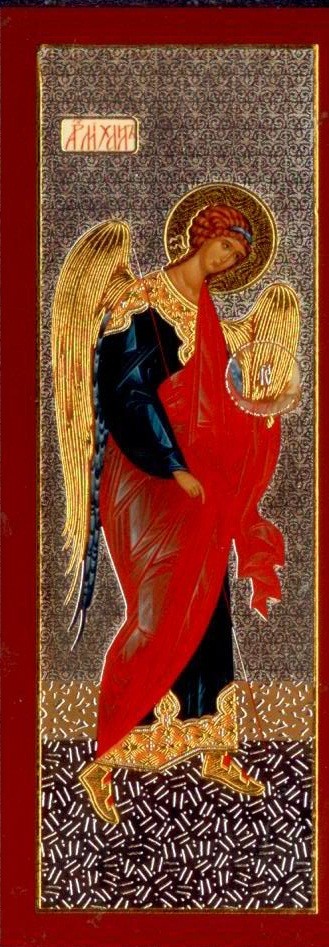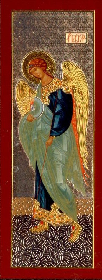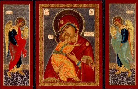 Очень красивая и сильная икона - складень, двойное тиснение золотом и серебром. На центральной иконе изображена Владимирская Пресвятая Богородица и Иисус на руках. На левой иконе изображен святой архангел Михаил, на правой - святой архангел Гавриил.