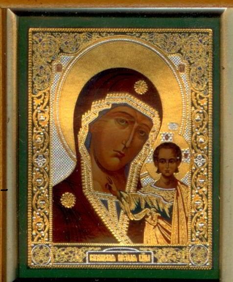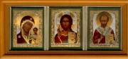 Тройная икона в деревянной раме, золотого и серебряного двойного тиснения, под защитным стеклом.