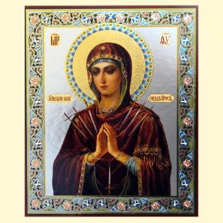 На иконе «Умягчение злых сердец» («Семистрельная») Пресвятая Богородица изображена пронзённой семью стрелами. Долгое время это было на повороте лестницы колокольни церкви в честь апостола Иоанна Богослова (недалеко от Вологды). Лицом вниз икона приняла на себя обычную доску, после чего, пока не ослабло зрение, отправилась в город Кадникова, что получит исцеление после молитвы пред от этой иконы. Перед найденной иконой была совершена служба, после которой больной выздоровел. Особенно прославилась икона в 1830 году во время свирепствовавшей в Вологде холеры.