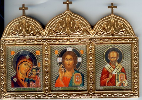 Русская икона для автомобиля, тройная золотая рамка с крестами. Казанская Богородица, Христос Спаситель и Николай Чудотворец. На обратной стороне значка имеется клейкая лента для крепления значка к салону автомобиля.