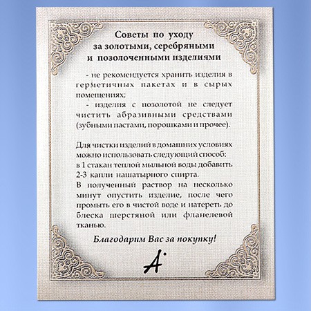 Подвески-кулоны на нашейные цепочки и браслеты  не предназначены для детей до 3 лет. Опасность удушья от проглатываемых мелких деталей. Не носить при физической работе, занятиях спортом, плаванием - опасность для тела, возможность удушения,  опасность повреждения изделий. Пожалуйста, используйте с осторожностью, чтобы избежать зацепления или повреждения продукта. Не носить во время сеанса сауны - риск ожога кожи, риск потери вставок. Избегайте контакта с водой, химическими веществами, моющими средствами или парфюмерией/косметикой, чтобы предотвратить обесцвечивание и повреждение поверхности. Редко встречается возможность кожной аллергической реакции.